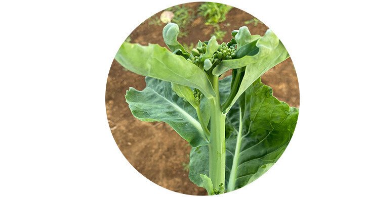 A hybrid Chinese broccoli with semi spreading, dark green leaves and white flowers.